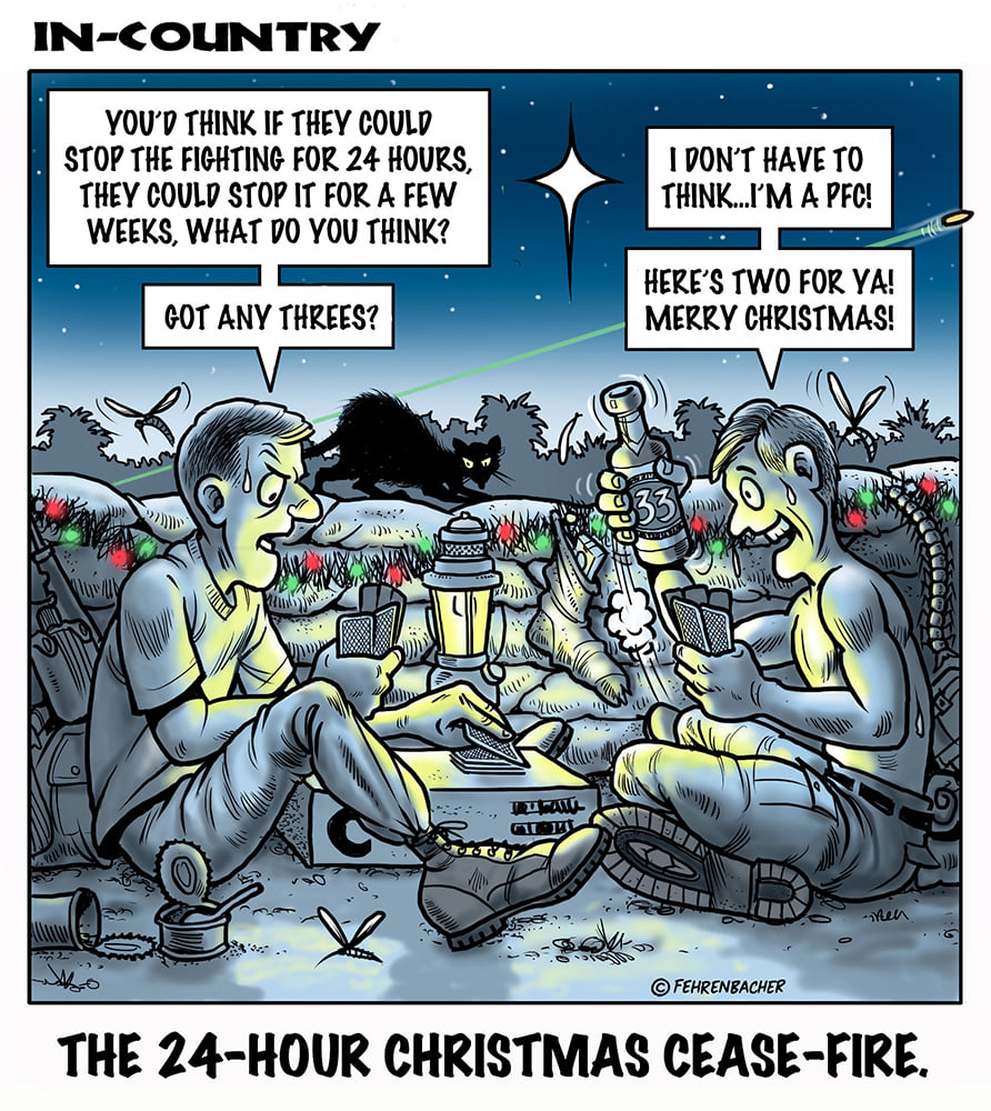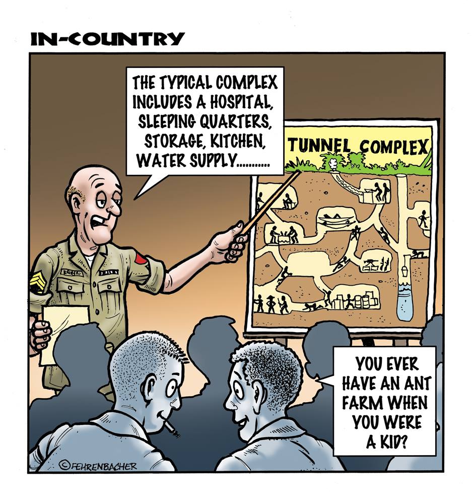 Phil enlisted in the Army in 1965 where you served for years in Vietnam.  He became a graphic designer and has worked for the state of Oregon for 26 years.  He retired in 2003 and started the Cartoon "In-Country".  The cartoons reflect his experiences during his tour of duty in South Vietnam.